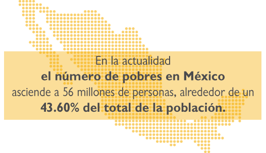 - En la actualidad el número de pobres en Mexico asciende a 56 millones de personas, alrededor de un 43.60% del total de la población.